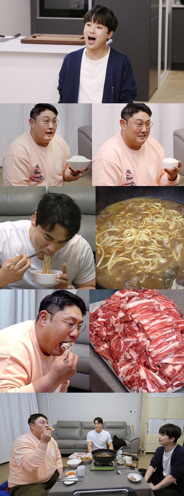 된장 샤부샤부를 메뉴로 선택한 이찬원은 채소 2kg와 차돌박이 5kg을 내왔다. 이는 무려 33인분에 해당하는 양으로, 두 형님은 “역시 찬원이야!”를 외치며 산더미 같은 고기를 맞이했다. 이찬원은 밥 6인분과 떡사리까지 꺼냈다. 두 사람의 본격적인 먹방이 시작됐고, 최준석은 차돌박이 10점을 가지런히 쌓아 한 입에 깔끔하게 넣었다.