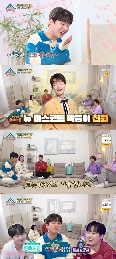 또한 이찬원은 “제가 어떤 문제든 MZ 세대로서 접근 할 수 있다”라며 자신감을 드러냈다. 이어 “저는 KBS 아들이다. KBS 고정 프로그램만 세 개다”라고 밝히면서 의욕을 활활 불태웠고, 정형돈은 “올해 대상이네”라며 감탄했다.