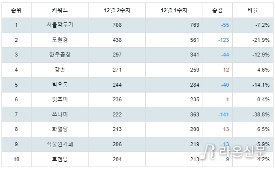 1위 서울깍두기는 트랜드지수 708점으로 전주보다 55점 하락했다.