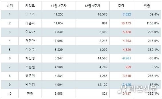 1위 이소라는 트랜드지수 11,256점으로 전주보다 7,322점 하락했다.
