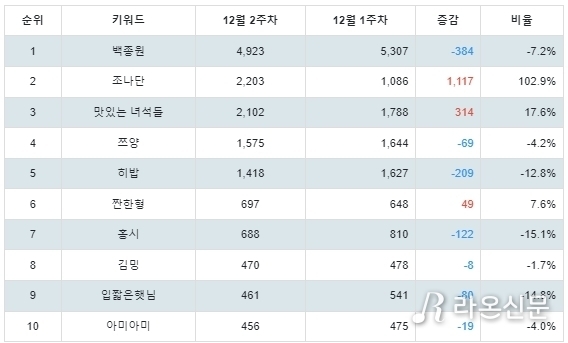 1위 백종원은 트랜드지수 4,923점으로 전주보다 384점 하락했다.