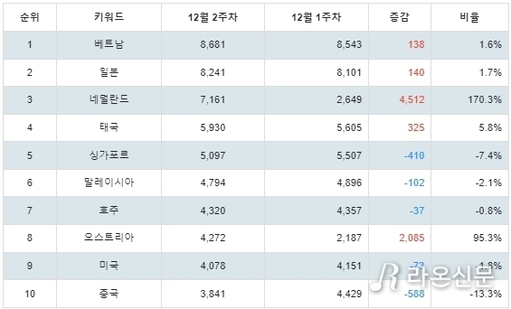 1위 베트남은 트랜드지수 8,681점으로 전주보다 138점 상승했다.