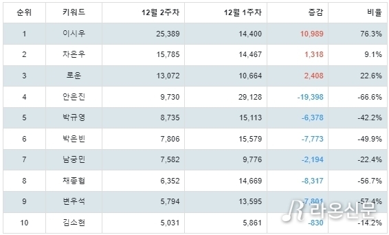 1위 이시우는 트렌드지수 25,389점으로 전주보다 10,989점 상승했다.