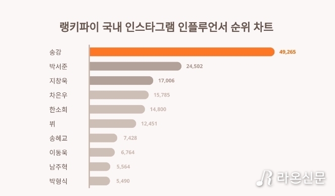 국내 인스타그램 인플루언서 트렌드지수에서 송강이 랭키파이 2023년 12월 3주차 트렌드지수 분석 결과 1위를 차지했다.