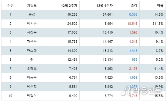 1위 송강은 트렌드지수 49,265점으로 전주보다 8,336점 하락했다.