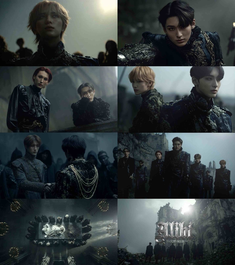 25일 소속사 잭소에 따르면, AI 버전 뮤직비디오 ‘Alibi: MOONLIGHT BLOOD ALLIANCE’는 말을 타고 달리는 장면부터 용과 맞서는 전투, 폐허를 걷는 전사적 이미지까지 판타지 영화 같은 장면들이 이어지며 압도적인 몰입감을 선사했다. 멤버들 뒤로 거대한 날개가 펼쳐지는 컷이나 마법을 구사하는 장면 역시 세계관의 깊이를 더해 곡과 자연스럽게 호흡을 맞췄다.