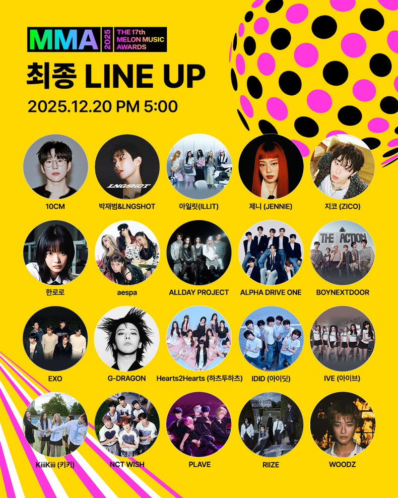 지드래곤(G-DRAGON), 박재범, 10CM, 지코, 엑소(EXO), 우즈(WOODZ), 제니(JENNIE), 에스파(aespa), 아이브(IVE), 한로로, 보이넥스트도어(BOYNEXTDOOR), 라이즈(RIIZE), 플레이브(PLAVE), 엔시티 위시(NCT WISH), 아일릿(ILLIT), 하츠투하츠(Hearts2Hearts), 키키(KiiiKiii), 올데이 프로젝트(ALLDAY PROJECT), 아이딧(IDID), 알파드라이브원(ALPHA DRIVE ONE) 등 글로벌 K팝을 대표하는 아티스트들과 슈퍼 루키들이 한자리에 모여 MMA2025를 위해 마련한 무대로 고척돔을 뜨겁게 달굴 전망이다.
