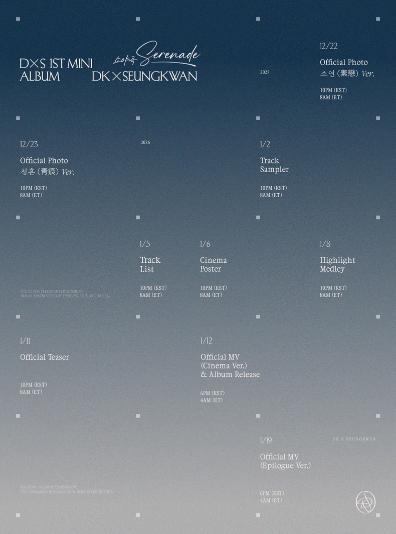 소속사 플레디스 엔터테인먼트는 지난 18일 오후 10시 세븐틴 공식 SNS에 도겸X승관 미니 1집 ‘소야곡’의 프로모션 스케줄러를 게재했다. 눈 내리는 밤의 풍경을 연상시키는 이미지가 겨울 감성 가득한 앨범을 기대하게 한다.
