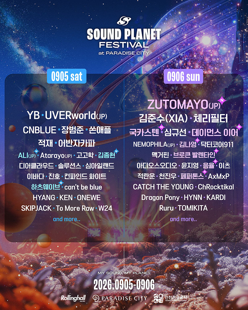 '사운드플래닛페스티벌 2026'이 28일 정오 공식 SNS를 통해 즛토마요, 페퍼톤스, 데이먼스 이어 등이 포함된 2차 라인업을 공개했다.