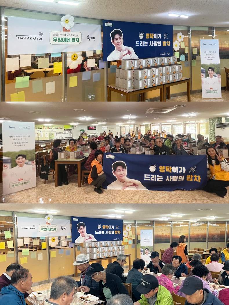 지난 17일 충남 아산시 온양노인복지센터에서 열린 이번 행사는 우양재단이 주관하고 '산탁클로스'가 후원하는 ‘영탁이가 드리는 사랑의 밥차’ 프로그램의 일환으로 진행됐다.