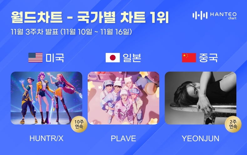그룹 헌트릭스(HUNTR/X)와 플레이브(PLAVE), 가수 연준(YEONJUN)이 한터 국가별 차트 각 부문 정상을 빛냈다.