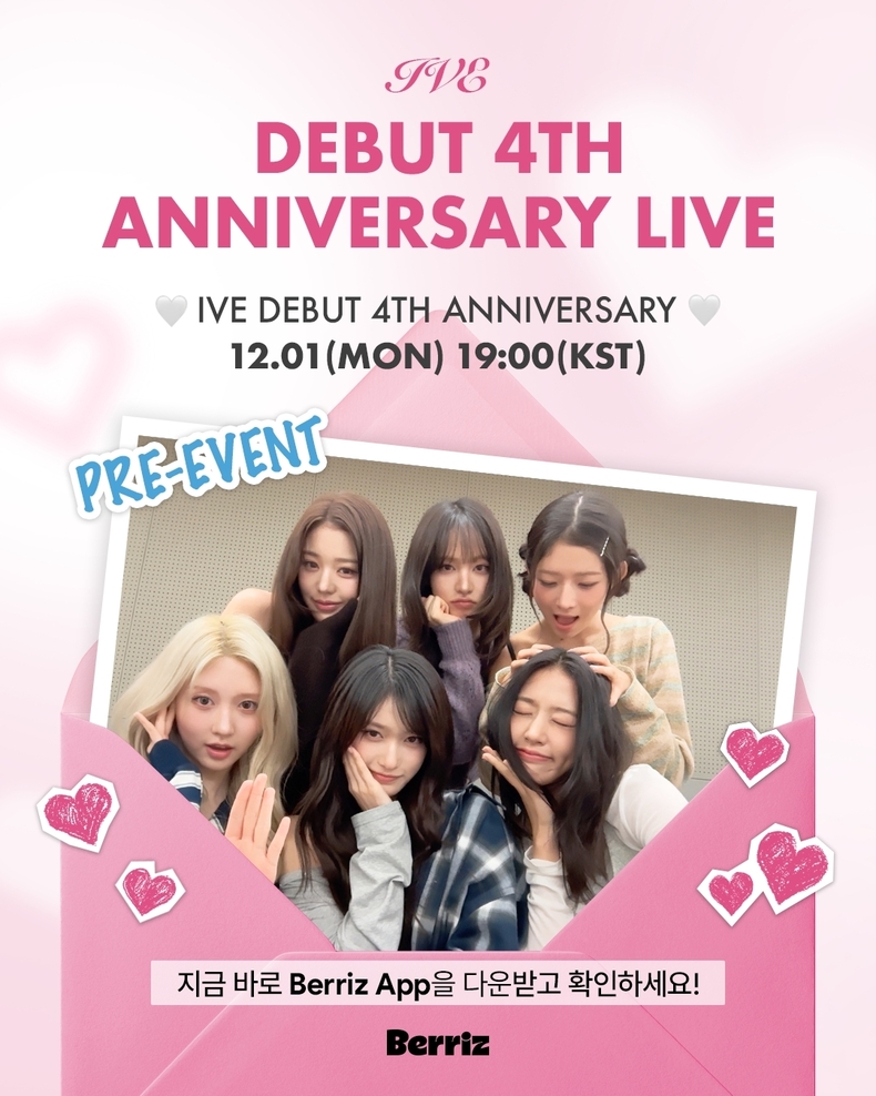 글로벌 K컬처 팬 플랫폼 베리즈(Berriz)에 따르면, 아이브는 1일 데뷔 4주년을 기념해 스페셜 라이브 '♡IVE DEBUT 4TH ANNIVERSARY♡'로 다이브(공식 팬클럽명) 함께한다. 이들은 이날 오후 7시 베리즈 내 공식 팬 커뮤니티를 통해 팬들을 찾는다.