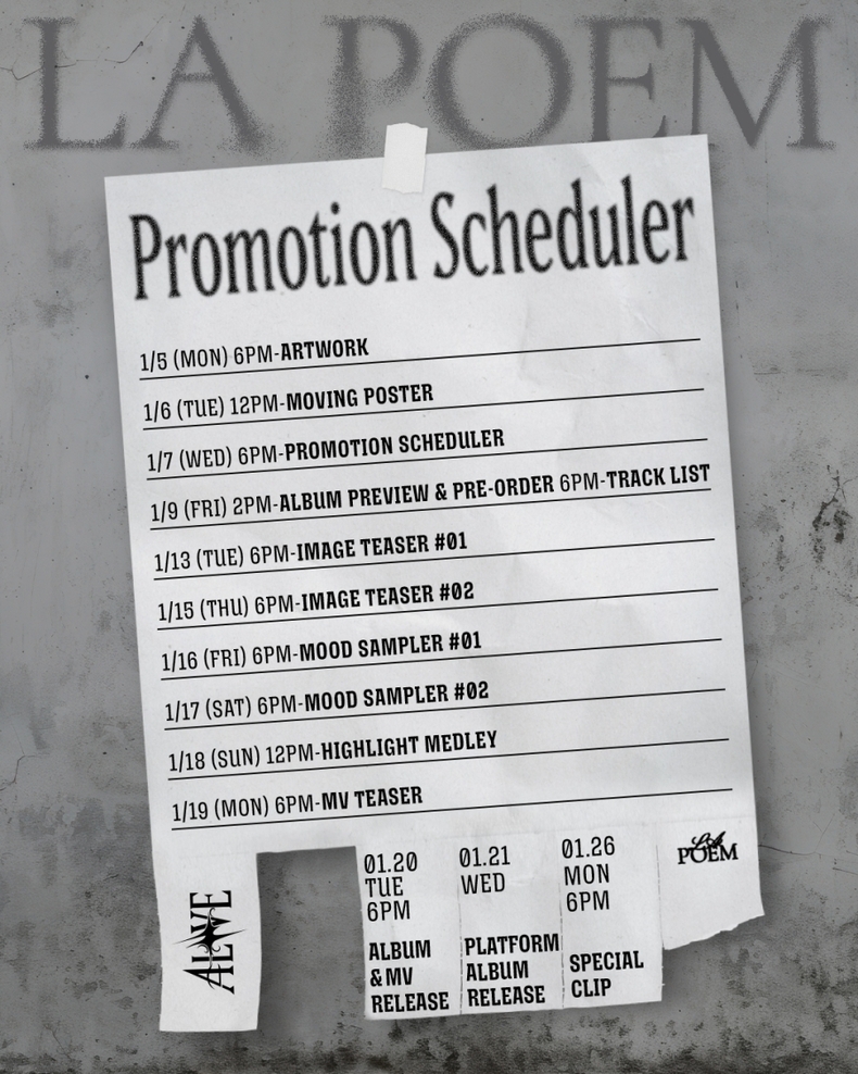 소속사 드라마하우스스튜디오는 지난 7일 오후 6시 공식 SNS를 통해 라포엠의 세 번째 미니 앨범 '얼라이브(ALIVE)' 프로모션 스케줄러를 게재했다.