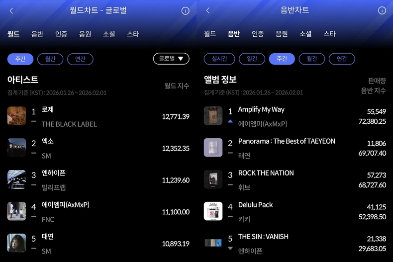 실시간 음악차트인 한터차트가 2일 발표한 2026년 1월 5주 차 주간차트에 따르면 로제와 에이엠피가 한터차트 1월 5주 차 월드차트와 음반차트에서 각각 1위를 차지했다.