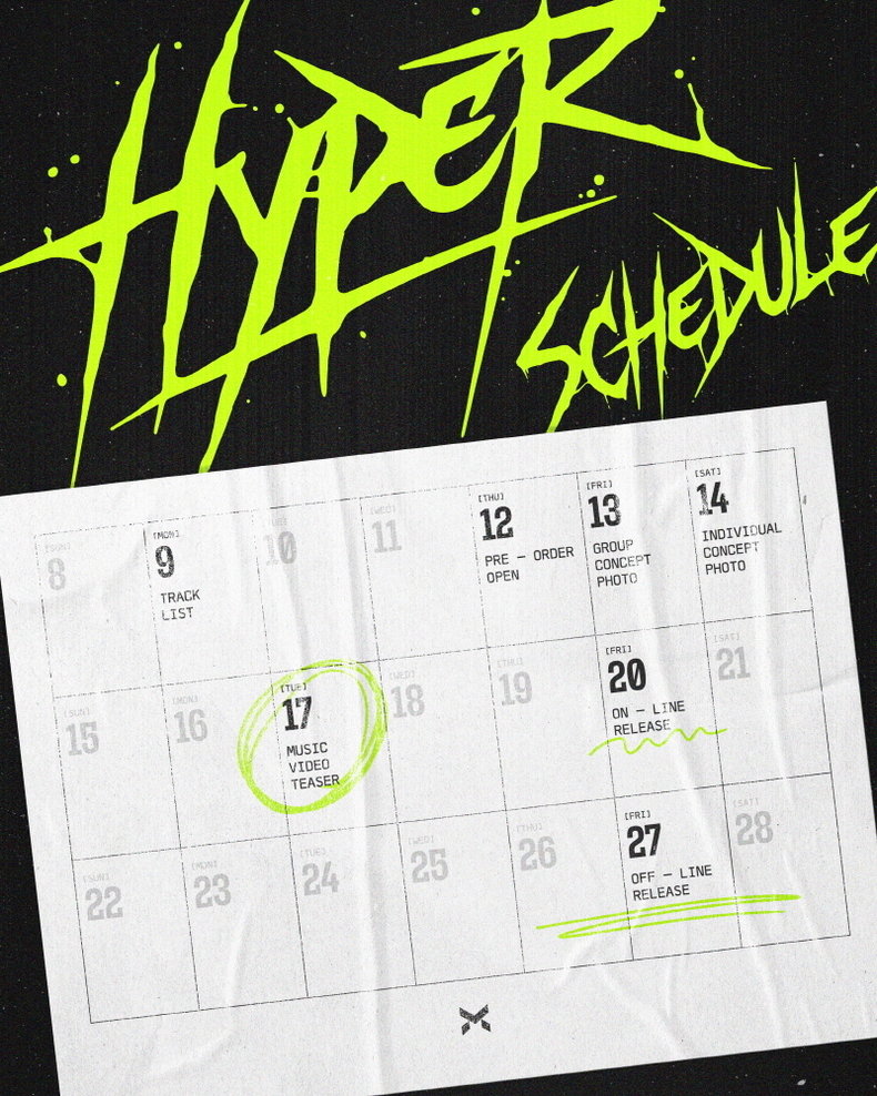 엑신은 스케줄러 이미지 속 강렬한 네온 그린 컬러의 ‘Hyper’ 타이포그래피와 거친 질감의 배경을 통해 특유의 파워풀하고 에너제틱한 색깔을 예고했. 매 활동마다 탄탄한 실력과 독창적인 콘셉트로 실력파의 면모를 입증해 온 엑신이 이번 신보를 통해 어떤 새로운 음악적 변신을 선보일지 관심이 모아진다.