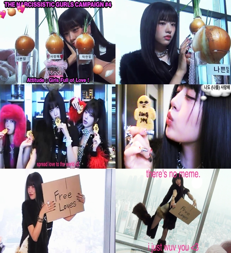 풀뱅 헤어스타일링으로 등장한 안유진은 양파 실험을 통해 메시지를 위트 있게 전달했다. 착한 말을 해줘야 잘 자란다는 실험에서 안유진은 '사랑해'라고 적힌 양파에 애정을 쏟는 한편, '나쁜 말'을 들어야 하는 양파에는 직접적인 표현 대신 "너는 안 사랑해"라고 표현해 눈길을 끌었다. 이를 통해 부정의 언어마저 사랑의 기준으로 재정의하며 'Attitude : Girls Full of Love!(사랑이 가득한 소녀들의 태도)'라는 메시지를 각인했다. 이어 쿠키를 들고 '너를 사랑해', '나도 (나를) 사랑해'라는 문구와 함께 러블리한 매력을 더하며 '더 나르시시스틱 걸스 캠페인'을 완성했다.