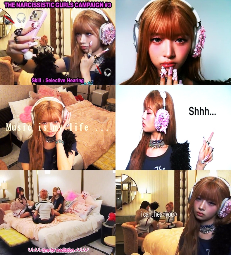 공개된 사진과 짧은 영상에는 두 멤버가 각자의 방식으로 자기애를 정의하는 장면들이 담겼다. 먼저 레이는 키치하게 꾸며진 헤드폰과 네일아트가 돋보이는 스타일링으로 트렌디한 무드를 완성했다. 'Skill : Selective Hearing(선택적 청취)'이라는 자막과 함께 주변의 소란 속에서도 자신의 세계와 음악에 몰입하는 레이의 모습은 타인의 시선이나 상황보다 자신의 내면과 좋아하는 것에 집중하는 주체적인 태도를 나타냈다. 특히, 멤버들과 둘러앉아 명상에 집중하는 장면에서는 "나는 그냥 예쁘다 / 이유는 없다 / 존재가 이유다"라는 내레이션이 더해지며, 나르시시즘을 당당한 자기 긍정의 에너지로 풀어냈다.