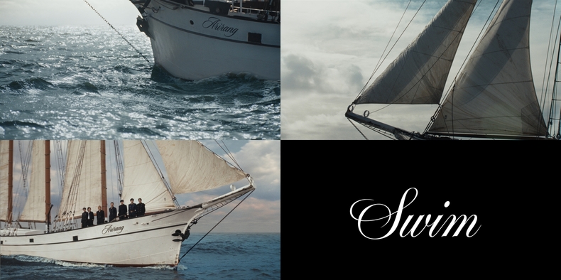 영상은 ‘SWIM’ 음원을 배경으로 바다를 가르며 나아가는 흰 범선의 뱃머리를 비추며 시작된다. 거대한 배 위에 나란히 선 이들은 흔들림 없이 정면을 응시한다. 한 편의 영화 같은 웅장한 연출과 멤버들의 단단한 기세는 본편에 대한 기대감을 최고조로 끌어올린다.