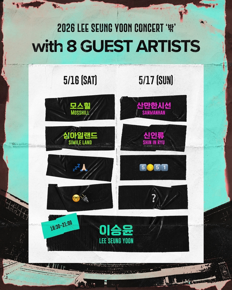 이날 이승윤 공식 SNS로 공개된 '밖' 포스터를 통해 단독 콘서트임에도 양일간 총 8팀의 게스트 아티스트가 참여를 예고해 눈길을 끈다. 현재까지 모스힐, 산만한시선, 심아일랜드, 신인류까지 4팀이 공개됐으며, 나머지 4팀은 추후 베일을 벗는다. 포스터 속 일부 게스트가 이모지로 표현돼 궁금증을 더하는 가운데, 게스트 아티스트의 무대를 통해 현장의 열기가 더욱 고조될 전망으로 이목이 쏠린다.