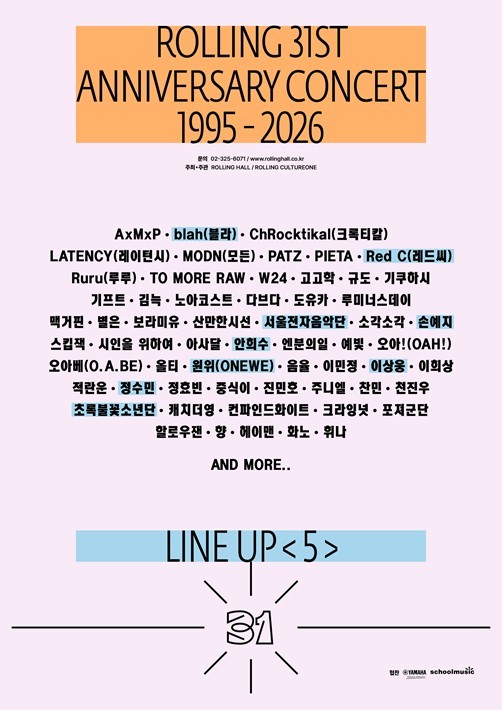 ‘롤링홀 31주년 기념공연’의 5차 라인업에는 원위(ONEWE), 서울전자음악단, 손예지, 초록불꽃소년단, 정수민, 안희수, Red C(레드씨), 이상웅, blah(블라) 등 총 9팀이 이름을 올렸다.