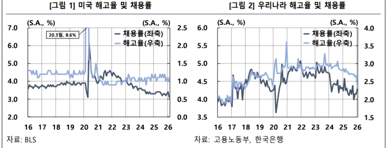 한국은행은 10일 '우리나라에도 저해고·저채용 현상이 나타나고 있는가?'라는 제목의 보고서를 통해, 미국 노동시장에서 먼저 뚜렷하게 나타난 저해고·저채용 현상이 국내에서도 2023년 이후 관측되고 있다고 설명했다. 해고율은 낮은 수준을 유지하는 반면 채용률은 하락세를 이어가고 있으며, 비자발적 이직과 신규채용이 동시에 줄어드는 흐름이 이어지고 있다는 것이다.