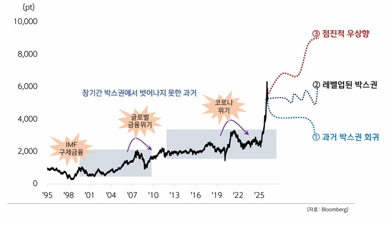 연구소는 과거에도 몇 차례 상승 랠리가 있었지만 주주보호 미흡 등 디스카운트 요인과 수급 불안정성 등으로 박스권을 벗어나지 못했다고 분석한 뒤 밸류업 강화에 따른 한계기업 퇴출 흐름 정착 시 코스피가 과거 박스권(1500~3000)으로 회귀할 가능성은 낮다고 진단했다.