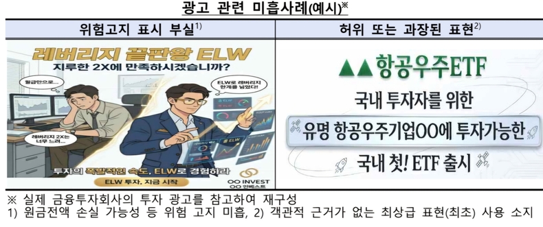 당국이 문제 사례로 제시한 광고에는 배당투자를 두고 수익을 사실상 보장하는 듯한 표현을 쓰거나, 실현되지 않은 목표 수익률을 내세우는 방식이 포함됐다. ‘글로벌 1위’처럼 비교 기준과 출처가 빠진 최상급 표현, 과거 실적을 보여주면서 미래 수익이 보장되지 않는다는 점을 누락한 사례도 지적됐다.