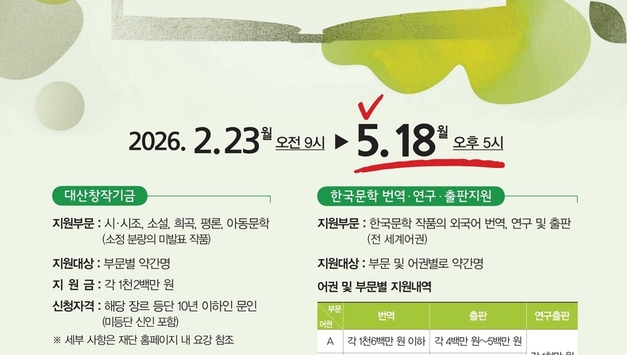 대산문화재단은 '2026 한국문학 번역·연구·출판지원’ 사업 공모를 시행한다고 23일 전했다. 대산문화재단은 교보생명의 공익재단이다. 번역·출판지원은 국적에 상관없이 한국문학작품을 외국어로 번역하고자 하는 번역가(공동 번역 혹은 단독 번역), 한국문학을 소개하고자 하는 해외 출판사 등이 신청할 수 있다. 번역대상작은 ▲제33회 대산문학상 수상작 또는 ▲해외에 소개할 가치 있는 한국문학 작품이다. 연구·출판지원의 경우 해외에서 한국문학을 연구하고 있는 교수, 연구인, 학생, 한국문학 번역가, 연구기관 등이 지원할 수 있으며, 출판지원은 한국문학 번역 작품의 해외 출간을 희망하는 해외 출판사에서 신청할 수 있다. 선정된 번역자에게는 어권 및 분량에 따라 최고 1600만원의 지원금을 지원한다. 지원자는 소정 양식의 신청서 및 공동번역자 이력서를 작성하고 샘플 번역 원고(시 : 20편, 산문 장르 : A4용지 30장)나 샘플 연구 원고(A4용지 30장), 번역 대상 원작 및 번역·출판계획서나 연구계획서를 대산문화재단 홈페이지를 통해 접수하면 된다. 공모 기간은 오는 5월 18일 오후 5시까지다.