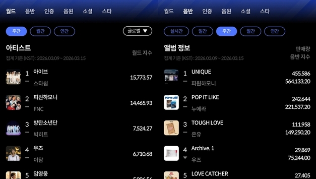 그룹 아이브(IVE)와 코르티스(CORTIS)가 한터차트 1월 2주 주간차트 정상에 올랐다. 실시간 음악차트인 한터차트가 12일 발표한 2026년 1월 2주 차 주간차트에 따르면, 아이브와 코르티스가 한터차트 1월 2주 차 월드차트와 음반차트에서 각각 1위를 차지했다. 주간 월드차트에서는 아이브가 1위에 올랐다. 아이브는 음원 부문에서 높은 점수를 획득하며 1만 2652.85점의 월드 지수를 얻었다. 이어 우즈가 월드 지수 1만 1466.05점으로 2위, 코르티스가 월드 지수 1만 1100.00점으로 3위에 자리했다. 주간 음반차트에서는 코르티스가 1위에 올랐다. 코르티스는 첫 번째 미니 앨범 ‘COLOR OUTSIDE THE LINES'로 1월 2주 음반 지수 22만 9502.53점(17만 6984장)을 기록하며 정상에 이름을 올렸다. 주간 음반차트 2위는 음반 지수 20만 7802.30점(43만 1377장)을 기록한 아이덴티티의 두 번째 미니 앨범 ‘yesweare’이며, 3위는 음반지수 6만 255.55점(4만 6952장)의 에이핑크 열한 번째 미니 앨범 ‘RE : LOVE’였다. 한터차트의 1월 2주 차 주간 차트 집계 기간은 지난 5일부터 11일까지