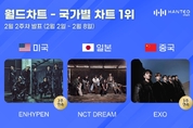 그룹 엔하이픈과 NCT 드림, 엑소가 한터 국가별 차트를 빛냈다. 실시간 음악차트인 한터차트가 13일 발표한 2월 2주 차(집계 기간 2~8일) 미국, 일본, 중국 국가별 차트 TOP 30에 따르면 엔하이픈(ENHYPEN), 엔시티 드림(NCT DREAM), 엑소(EXO)가 한터 국가별 차트 각 부문 1위에 올랐다. 미국 부문에서는 엔하이픈의 'THE SIN : VANISH'가 종합 지수 1만 8726.72점으로 2주 연속 정상을 차지했다. 다음으로 헌트릭스의 'Golden'(종합 지수 1만 8401.30점)이 2위, 캣츠아이의 'Gabriela'(7052.09점)가 3위에 자리했다. 일본 부문 왕좌의 주인공은 NCT 드림이었다. NCT 드림 'Beat It Up'의 종합 지수는 9941.21점이다. 다음으로 2위는 엑스지의 'THE CORE - 核'(9739.27점), 3위는 엔하이픈의 'THE SIN : VANISH(8988.66점)이었다. 중국 부문에서는 엑소의 'REVERXE'(2만 543.60점)가 3주 연속 1위의 영예를 안았다. 이어 코르티스의 'COLOR OUTSIDE THE LINES'(1만 6568.53점)가 2위, 도겸X승관의 '소야곡'(