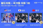 그룹 헌트릭스(HUNTR/X)와 베이비몬스터(BABYMONSTER)가 한터 국가별 차트 각 부문 1위에 올랐다. 실시간 음악차트인 한터차트가 24일 오전 발표한 10월 3주 차(집계 기간 13~19일) 미국, 일본, 중국 국가별 차트 TOP 30에 따르면 헌트릭스와 베이비몬스터가 각 부문 1위에 올랐다. 미국 부문에서는 헌트릭스의 'Golden(골든)'이 종합 지수 2만 2795.59점으로 6주 연속 정상을 지켰다. 다음으로 엔믹스의 'Blue Valentine'(1만 6517.55점)이 2위, 투어스의 'play hard'(7256.63점)가 3위에 자리했다. 일본 부문의 주인공은 베이비몬스터의 'WE GO UP(위 고 업)'이었다. 베이비몬스터 'WE GO UP'의 종합 지수는 1만 4637.06점이다. 다음으로 2위는 투어스의 'play hard'(1만 731.13점), 3위는 트와이스의 'TEN: The Story Goes On'(8603.45점)이다. 중국 부문에서도 베이비몬스터의 'WE GO UP'(2만 8218.75점)이 1위를 차지했다. 이어 엔믹스의 'Blue Valentine'(2만 5127.01점)이 2위, 진의 'Don't Say You