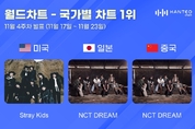 그룹 스트레이 키즈(Stray Kids)와 NCT 드림이 폭발적인 인기를 입증했다. 실시간 음악차트인 한터차트는 28일 발표한 11월 4주 차(집계 기간 11월 17일~11월 23일) 미국, 일본, 중국 국가별 차트 TOP 30에 따르면 스트레이 키즈와 NCT 드림이 한터 국가별 차트 각 부문 1위에 올랐다. 미국 부문에서는 스트레이 키즈의 'SKZ IT TAPE 'DO IT''이 종합 지수 2만 9439.66점으로 새롭게 정상을 차지했다. 다음으로 헌트릭스의 'Golden'(2만 8625.70점)이 2위, 연준의 'NO LABELS'(1만 5893.26점)가 3위에 자리했다. 일본 부문에서는 NCT 드림의 'Beat It Up'이 1위를 기록했다. NCT 드림 'Beat It Up'의 종합 지수는 1만 5860.81점이다. 다음으로 2위는 스트레이 키즈의 'SKZ IT TAPE 'DO IT''(8293.99점), 3위는 HANA의 'Blue Jeans'(6694.83점)이다. 중국 부문에서도 NCT 드림의 'Beat It Up'(1만 7901.33점)이 정상에 올랐다. 이어 세븐틴의 'HAPPY BURSTDAY'(1만 2944.81점)가 2위, 연준의 'N