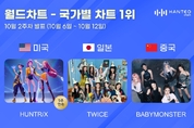 그룹 헌트릭스(HUNTR/X)와 트와이스(TWICE), 베이비몬스터(BABYMONSTER)가 한터 국가별 차트 정상을 차지했다. 실시간 음악차트인 한터차트가 17일 발표한 10월 2주 차(집계 기간 6~12일) 미국, 일본, 중국 국가별 차트 TOP 30에 따르면 헌트릭스, 트와이스, 베이비몬스터가 각 부문 1위에 올랐다. 미국 부문에서는 헌트릭스의 'Golden(골든)'이 종합 지수 3만 3128.52점으로 5주 연속 영향력을 과시했다. 다음으로 트와이스의 'TEN: The Story Goes On'(종합 지수 2만 178.58점)이 2위, 베이비몬스터의 'WE GO UP'(7344.57점)가 3위에 자리했다. 일본 부문에서는 트와이스가 정상에 올랐다. 트와이스 'TEN: The Story Goes On'의 종합 지수는 1만 1906.38점이다. 다음으로 2위는 해찬의 'TASTE'(1만 1704.92점), 3위는 스트레이 키즈의 'KARMA'(7770.24점)이다. 중국 부문의 주인공은 베이비몬스터의 'WE GO UP'(1만 9568.56점)이었다. 이어 트와이스의 'TEN: The Story Goes On'(1만 8182.81점)이 2위, 진의 'Don