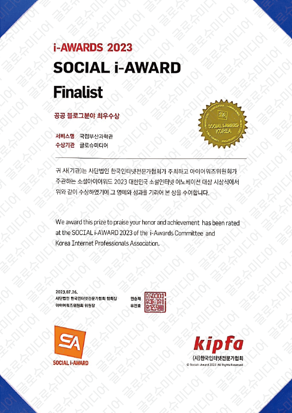 최우수상을 받은 글로슈미디어는 국립부산과학관의 주요 사업 및 시설안내, 과학 관련 지식 콘텐츠, 고객 참여 이벤트 등 다양한 주제의 홍보 콘텐츠를 만들어 국민들이 알기 쉽고 공감과 흥미를 유발할 수 있도록 전달했다는 평가를 받았다.