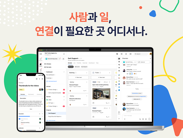 ‘스윗(Swit)’은 AI와 오토메이션에 기반해 △채팅 △업무관리 △목표관리 △전자결재 등 팀∙부서 간 협업에 필요한 모든 기능을 제공하는 글로벌 협업 플랫폼이다. MS365, 구글 워크스페이스와의 유기적인 연동을 통해 업무에 필수적으로 필요한 메일, 파일 관리, 일정관리, 화상회의 기능과의 연동은 물론, 전자결재나 목표설정(OKR)과 같은 전사적 협업에 필요한 기능을 하나의 플랫폼에서 제공한다. 특히 AI가 적용돼 생산성 향상에 기여하며, 사용자별 자동화된 업무 흐름도 만들 수 있는 오토메이션 기능도 제공한다. 대표적인 고객사례로는 대한항공, 에스앤아이, YG-1 등 다수의 국내외 대기업 및 중견기업이 있다.