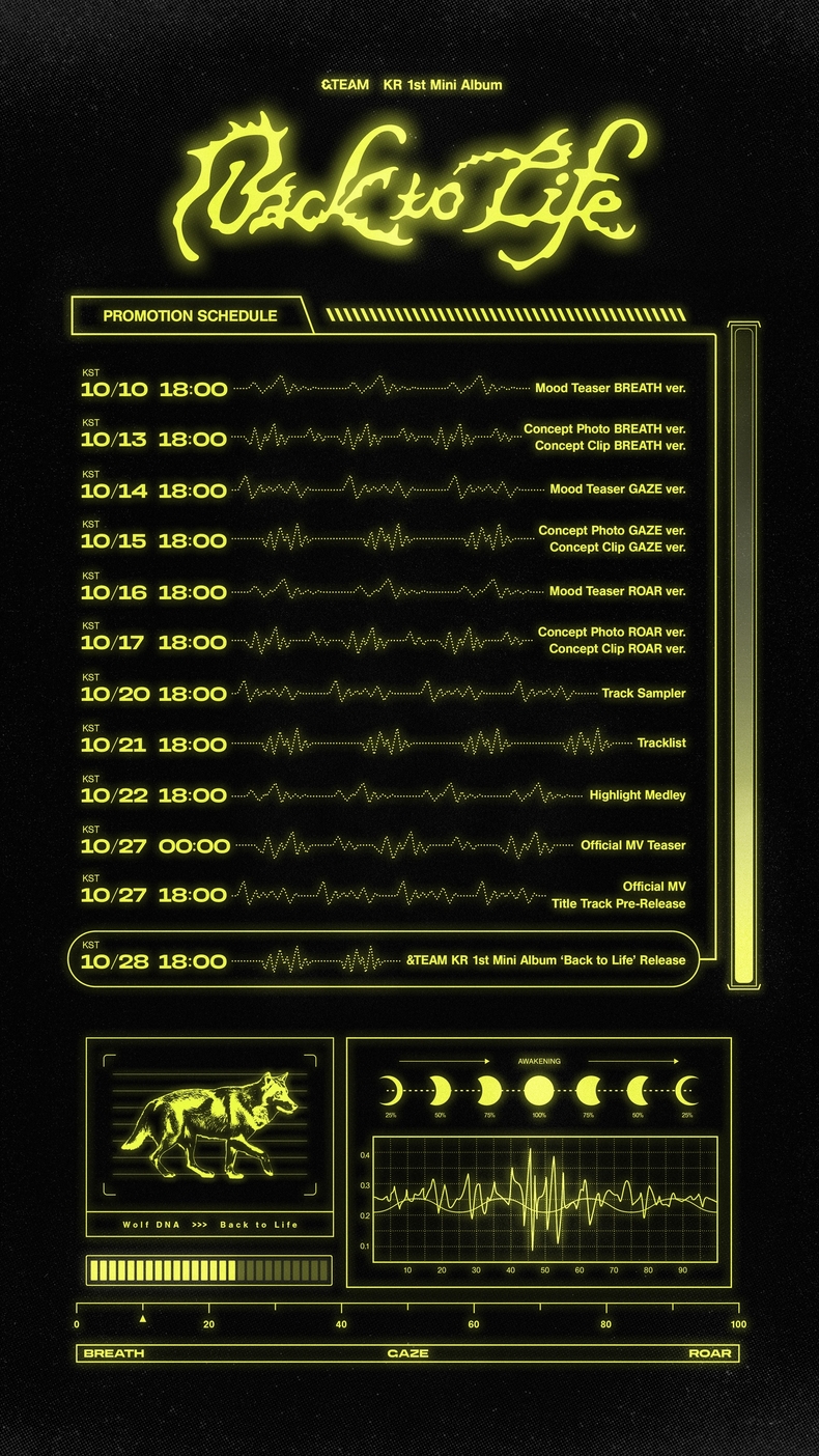 '숨(BREATH)', '응시(GAZE)', '포효(ROAR)'로 이어진 흐름에 따라 깨어나는 앤팀의 서사도 기대된다. 팀 정체성인 'Wolf DNA'와 'Back to Life' 문구가 새겨진 박스 플롯(Box Plot) 옆에, 달이 차오르면 이들이 'Awakening(각성)'한다는 표식이 더해져 한층 진화한 &TEAM의 행보가 암시됐다.