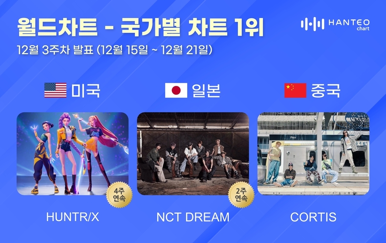 실시간 음악차트인 한터차트가 26일 발표한 12월 3주 차(집계 기간 15~21일) 미국, 일본, 중국 국가별 차트 TOP 30에 따르면 헌트릭스, NCT 드림, 코르티스가 각 부문 1위에 올랐다.