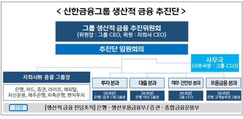 신한금융은 프로젝트의 신속성과 효과성을 높이기 위해 이번에 '그룹 생산적 금융 추진단'을 신설했다. 신설 그룹 생산적 금융 추진단은 그룹 최고전략책임자(CSO)가 사무국장을 맡는 추진 사무국을 중심으로 ▲투자 ▲대출 ▲재무·건전성 ▲포용금융 등 4개 분과로 구성된다.