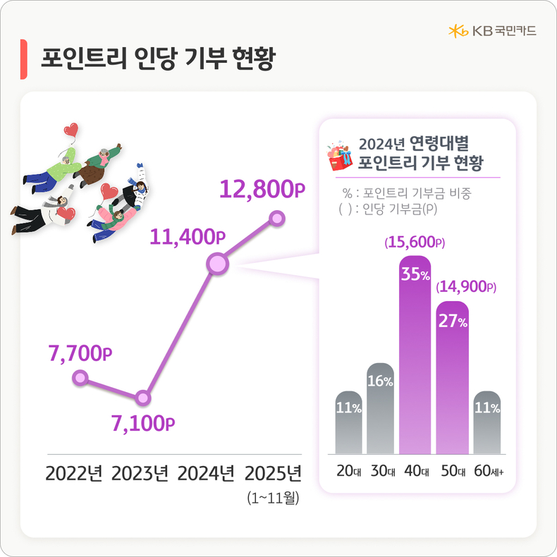 KB금융그룹의 통합 포인트인 포인트리를 통한 기부도 매년 증가 추세다. 지난 2022년 포인트리를 통한 1인당 기부금은 7700포인트리(P)에서 2025년(11월 기준) 1만2800P로 상승했다.