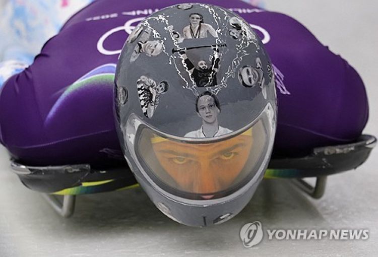 헤라스케비치는 9일(현지시간) 이탈리아 코르티나 슬라이딩 센터에서 전쟁의 희생자가 된 우크라이나 스포츠 선수들의 모습이 들어간 헬멧을 쓰고 연습 주행을 해 주목받았다.