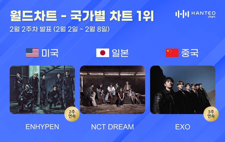실시간 음악차트인 한터차트가 13일 발표한 2월 2주 차(집계 기간 2~8일) 미국, 일본, 중국 국가별 차트 TOP 30에 따르면 엔하이픈(ENHYPEN), 엔시티 드림(NCT DREAM), 엑소(EXO)가 한터 국가별 차트 각 부문 1위에 올랐다.