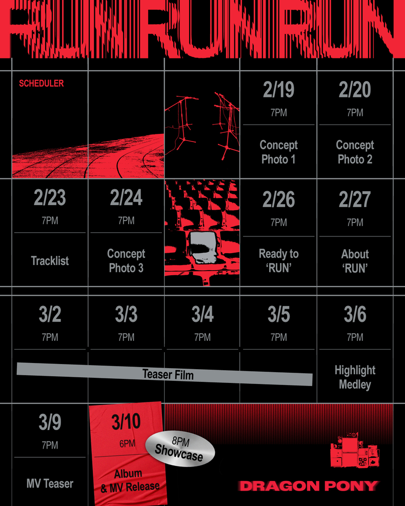 공개된 스케줄러 이미지에는 강렬한 블랙 앤 레드 톤의 조화 속에 앨범 타이틀 로고인 'RUN RUN RUN'이 등장한다. 타이포그래피로 강조된 파열감은 드래곤포니가 이번 EP로 보여줄 음악적 에너지를 기대케 했다.