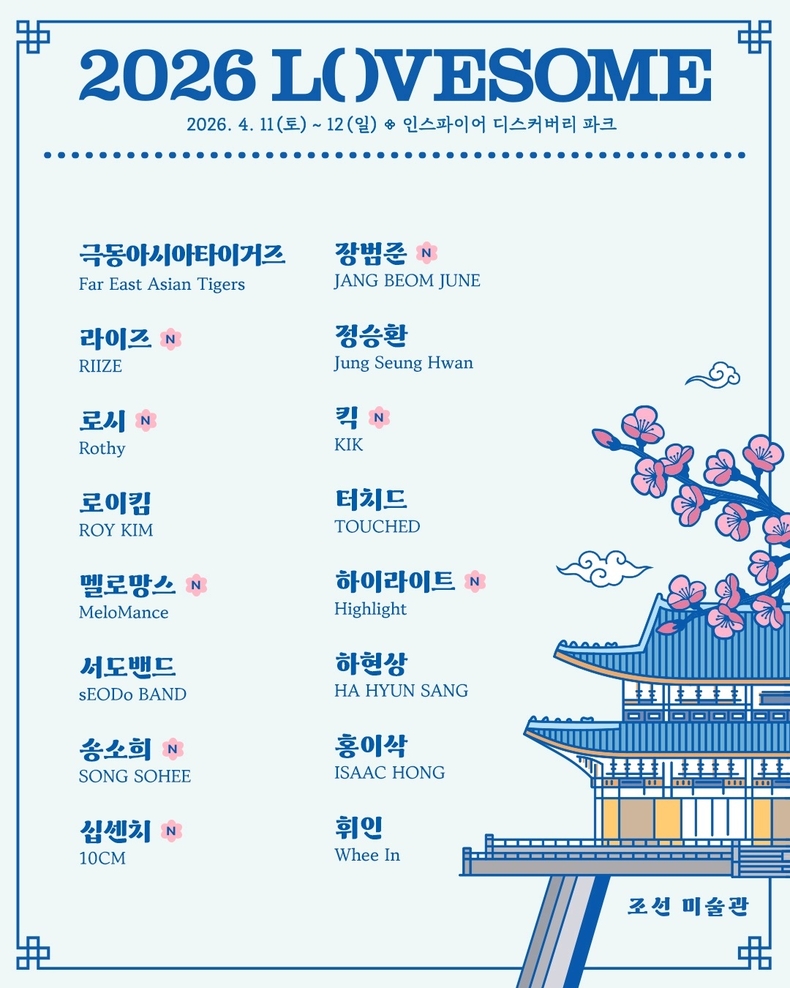 ‘2026 러브썸(LOVESOME) 페스티벌’이 봄을 완성할 최종 라인업을 공개했다. 오는 4월 11일부터 12일까지 인스파이어 디스커버리 파크에서 개최되는 러브썸은 올해의 도서로 선정된 ‘조선미술관’을 테마로 한다.