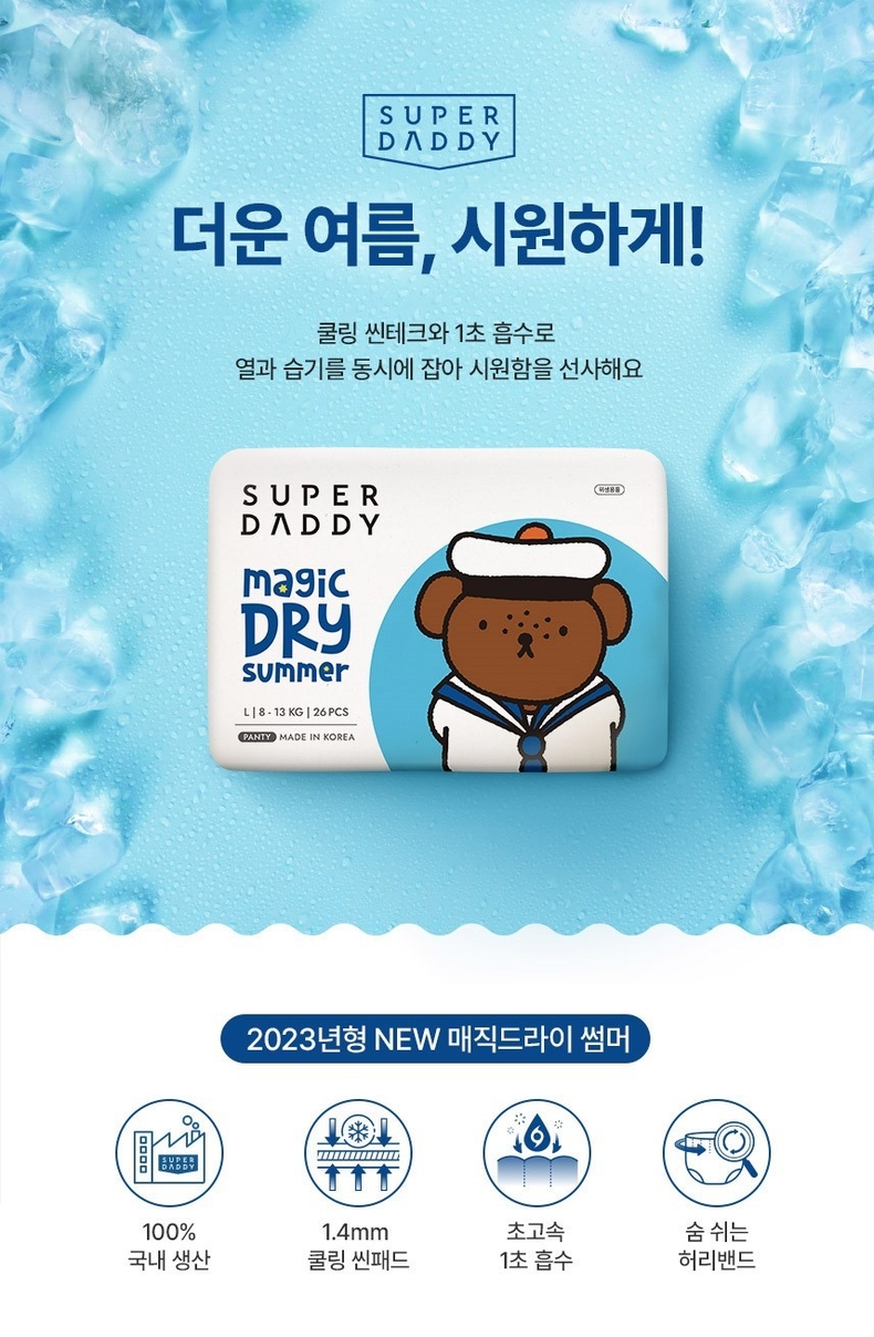 매직드라이 썸머는 세계적인 인기 캐릭터 미피와 콜라보한 제품으로 기존 매직드라이의 여름 버전이다. 매직드라이 썸머는 초고속 에어링 3중 흡수 트랙이 빠른 흡수를 자랑해 많은 양도 한 번에 흡수한다. 흡수 속도가 느릴 경우 찝찝함은 물론 더운 여름 민감한 아이 피부에 발진이 일어날 수 있어 주의해야 한다. 실제 슈퍼대디 측은 작년 썸머 기저귀 대비 64% 개선된 흡수 속도라 밝혔다. 다리 사이 높은 레그밴드는 샘을 한 번 더 막아줘 활동이 많은 아이도 샘 걱정 없다.