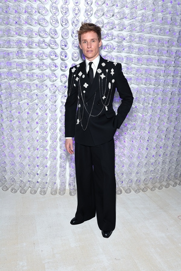 현지 시간으로 5월 1일 월요일, 2023 멧 갈라(Met Gala) 행사에 참석한 영화배우 에디 레드메인(Eddie Redmayne)이 진주 브로치와 드레이프 체인 자수 디테일이 매력적인 알렉산더 맥퀸의 커스텀 더블 브레스티드 테일러드 턱시도 재킷과 이중으로 주름이 잡힌 와이드 팬츠를 아이보리 실크 포플린 소재의 셔츠, 그리고 블랙 실크파유 소재의 타이, 블랙 가죽 소재의 부츠를 더해 완벽한 수트핏을 연출했다.