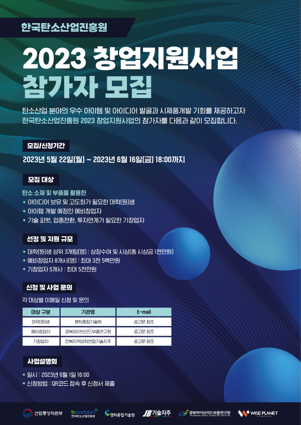 주관기관 관계자는 “지속 가능한 탄소산업 생태계를 조성하고 경쟁력 제고를 위한 전문인력 양성을 위해 아낌없이 지원할 예정이다”며 “탄소산업분야에 대한 아이디어 및 아이템을 가지고 있는 분들의 많은 지원 부탁드리겠다”고 전했다.
