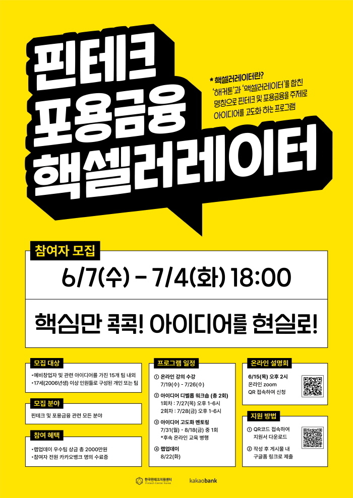 한국핀테크지원센터 이사장은 “최근 AI·빅데이터 등 디지털 신기술로 인해 금융의 디지털화, 플랫폼화, 탈중개화 등 금융혁신이 급격히 진행되고 있다. 이러한 변화 속에서 금융사회 안전망 강화를 위한 새롭고 혁신적인 아이디어를 공유해 보는 기회가 됐으면 한다”며, “앞으로도 한국핀테크지원센터와 카카오뱅크는 청년과 창업자들에게 실습과 특강, 멘토링 등 액셀러레이팅 프로그램을 통해 아이디어 검증부터 실현까지 단계적으로 지원해 우수한 아이디어가 창업과 스케일업을 거쳐 유니콘 기업으로 성장하는 계기가 될 수 있도록 적극 지원할 계획”이라고 밝혔다.
