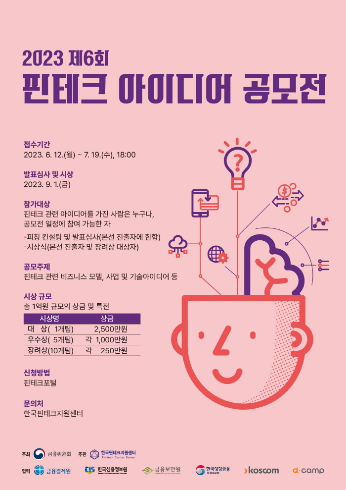 올해로 6회를 맞이한 핀테크 아이디어 공모전은 별도 제한 없이 핀테크 관련 아이디어를 가진 국민 누구나 참여할 수 있으며, 개인 또는 팀(5인 이하)으로 참가할 수 있다.