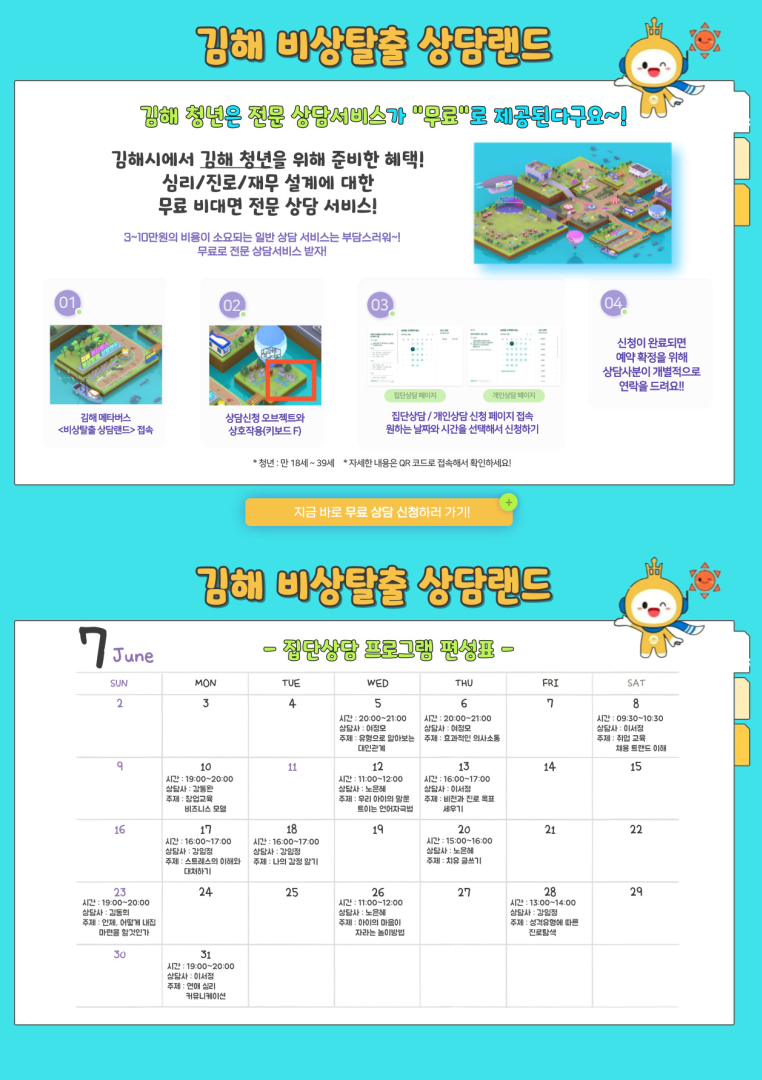 김해 청년들(만15~39세)의 비대면 상담 서비스 니즈를 해소하기 위해 만들어진 ‘비상탈출 상담랜드’는 7월에는 육아, 취창업, 정책, 심리 등 다양한 주제로 구성된 집단 상담 프로그램을 운영하고 있으며, 7월 참가자 대상으로 20명을 선정해 커피 쿠폰을 지급한다. 더불어 상시 이벤트로 김해청년 이벤트를 진행하고 있다.