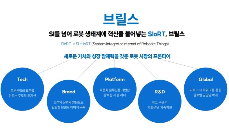 (주)브릴스는 SI(System Integrator)와 로봇 사물인터넷(Internet of Robot Thing, IoRT)의 통합을 특징으로 한 SIoRT 기업으로서, 로봇 기반 생산 라인 자동화와 고객 맞춤형 로봇 시스템을 제공하고 있다. RaaS(Robot-as-a-Service) 서비스를 통해 미래 성장 동력 사업인 지능형 로봇 자동화를 위한 표준화 소프트웨어와 하드웨어 플랫폼의 개발을 통해 로봇 시스템 분야의 리더로서 역할을 하고 있다.